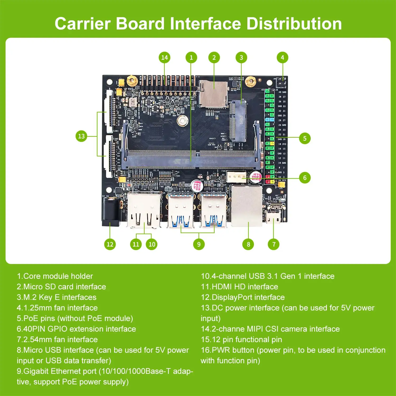 Комплект разработчика включает коммутационную плату (carrier board) с вычислительным модулем, радиатор для охлаждения, адаптер питания 5В/4А, карту памяти с устройство для подключения ее к компьютеру, HDMI-кабель USB-кабель, камеру IMX219, 7-дюймовый тач-дисплей с разрешением 1024*600 пикселей и кронштейном для монтажа, двухдиапазонный сетевой модуль (BT+WiFi)